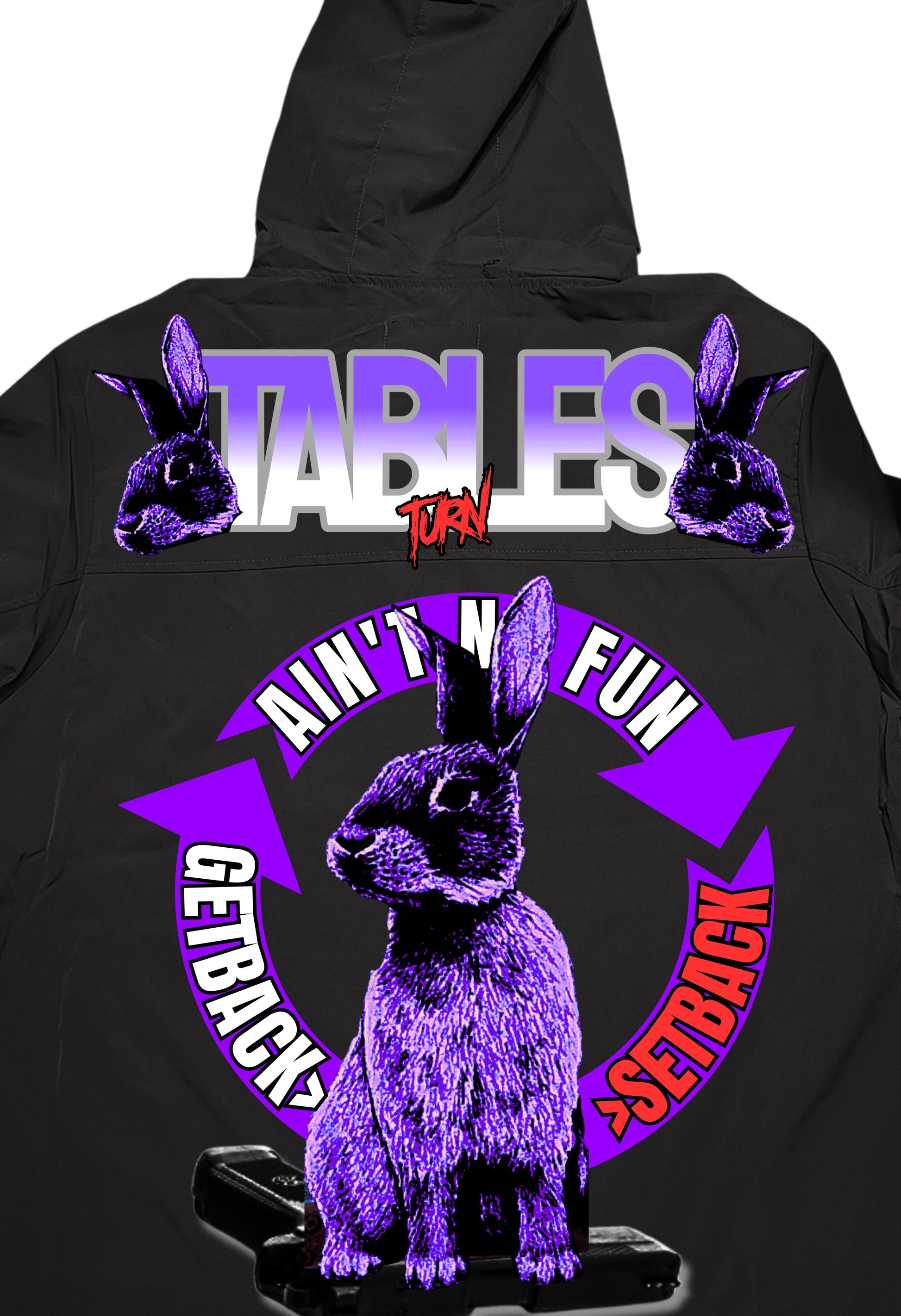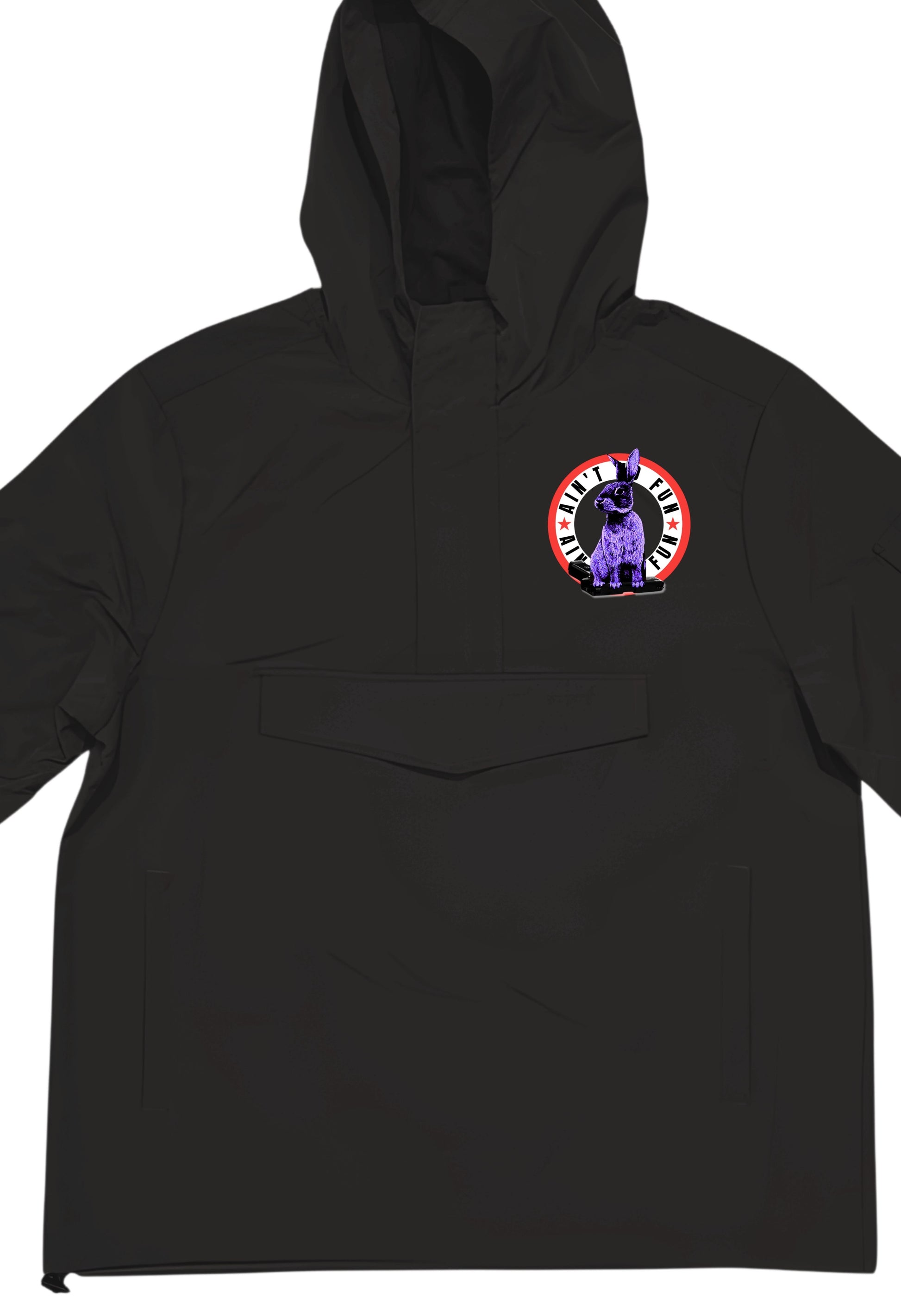 Anorak Jacket, hafl zip, wind and water resistant, zip pouch, left sleeve pocket, quality screenprint for the back, embroidery patch over the heart. Mesh lined hood. A stylish way to battle the fall elements. INCLUDES DIGITAL DOWNLOAD OF BLACK RABBIT